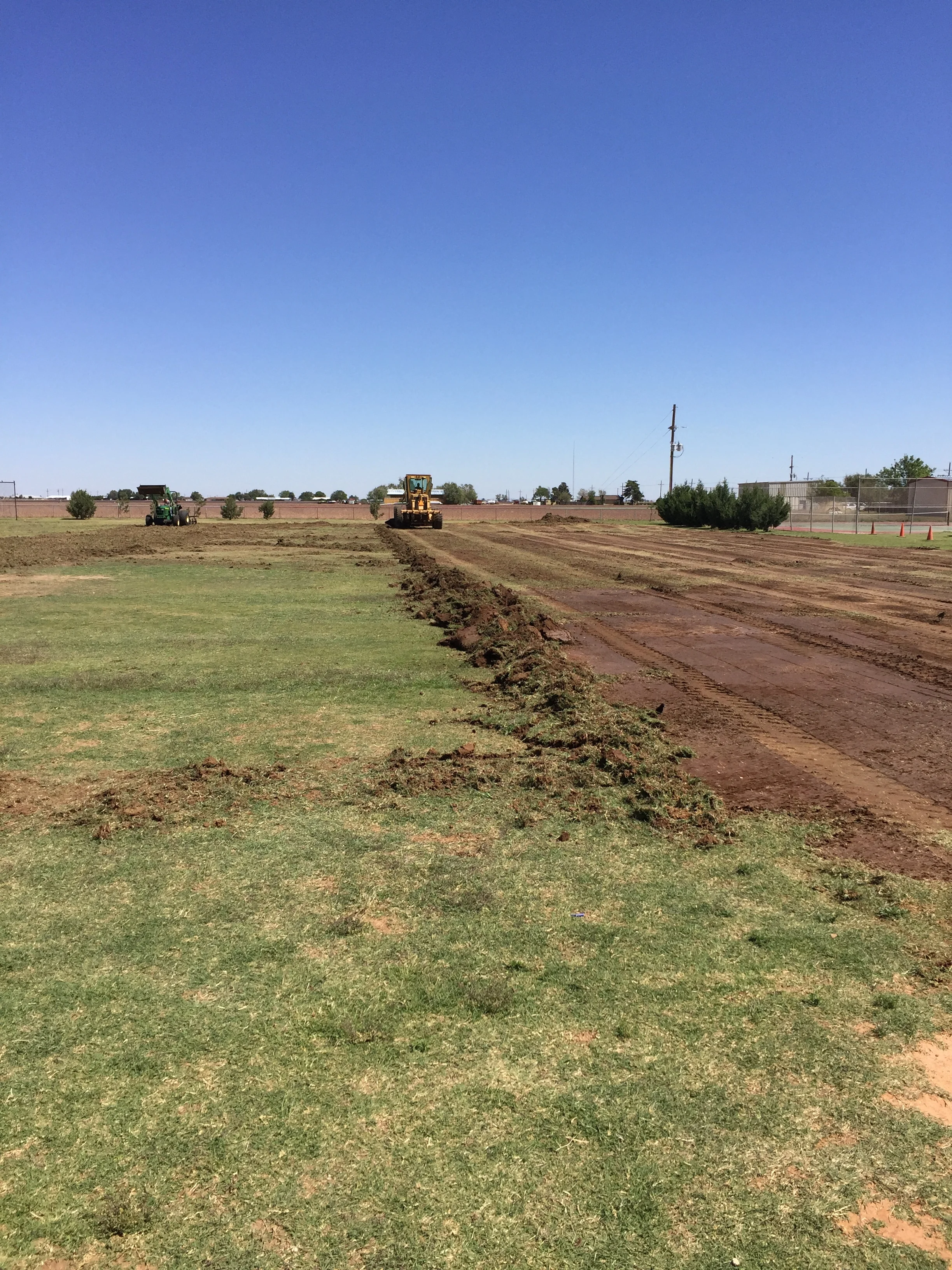 Notice the green spots after the top surface removal. These were low areas in the turf. Now those are level to the surrounding cut. Turf will rejuvenate and all will be smooth and safe for athletes to run on.